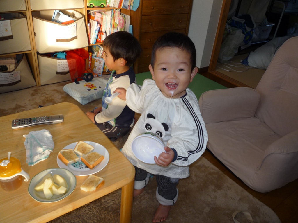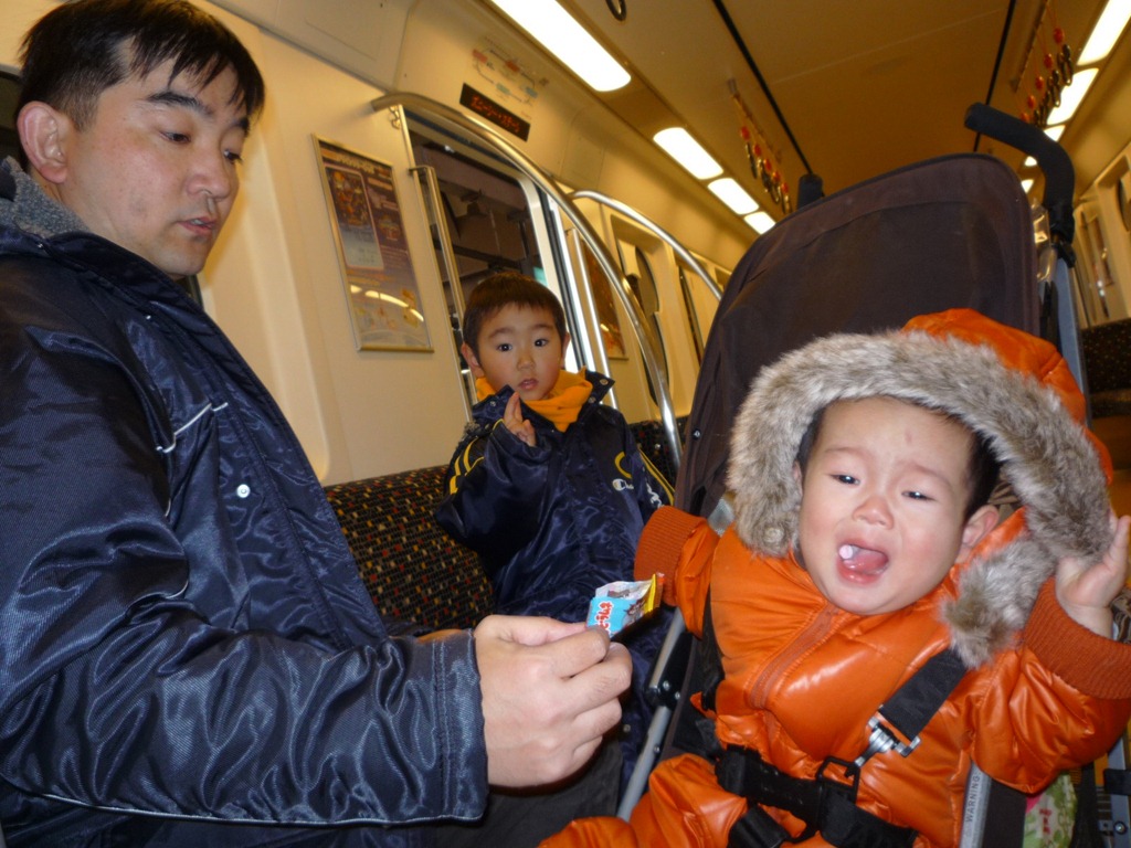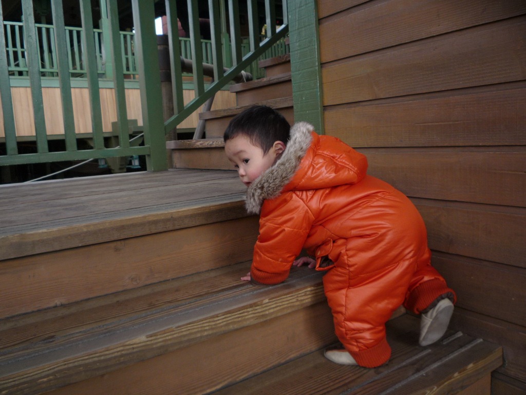 462日目 朝、やたら暑い服を着せられて不自由なので暴れてみる 確かに寒いね、そういうことね。 外は寒い、しかし並んで中に入るという概念はない とりえあずテンション高めてはしゃいでます。 腹減ったし、お昼を待てないので休憩、この後、この石からおちてたんこぶとなりました。 ぐずってやる、おむつもなんとかしてくれーってことで この後はひたすら後頭部となりました。 あの石はすごいアトラクションだったので次回は気を付けよう。