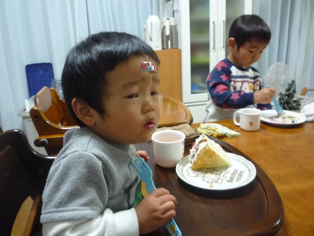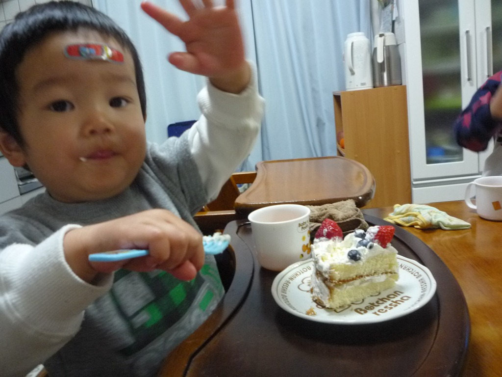 797日目 寒い朝なのに何やら山の中へ 木があるせいで暗がりなのです、フラッシュより照明が必要かな。 そして、富士川楽座で遊んで夜はケーキでした。 狙いはトッピングのゼリー、兄さんの分もちょっといただき ケーキが横になるとぐずります。 戻してもらって元気です。